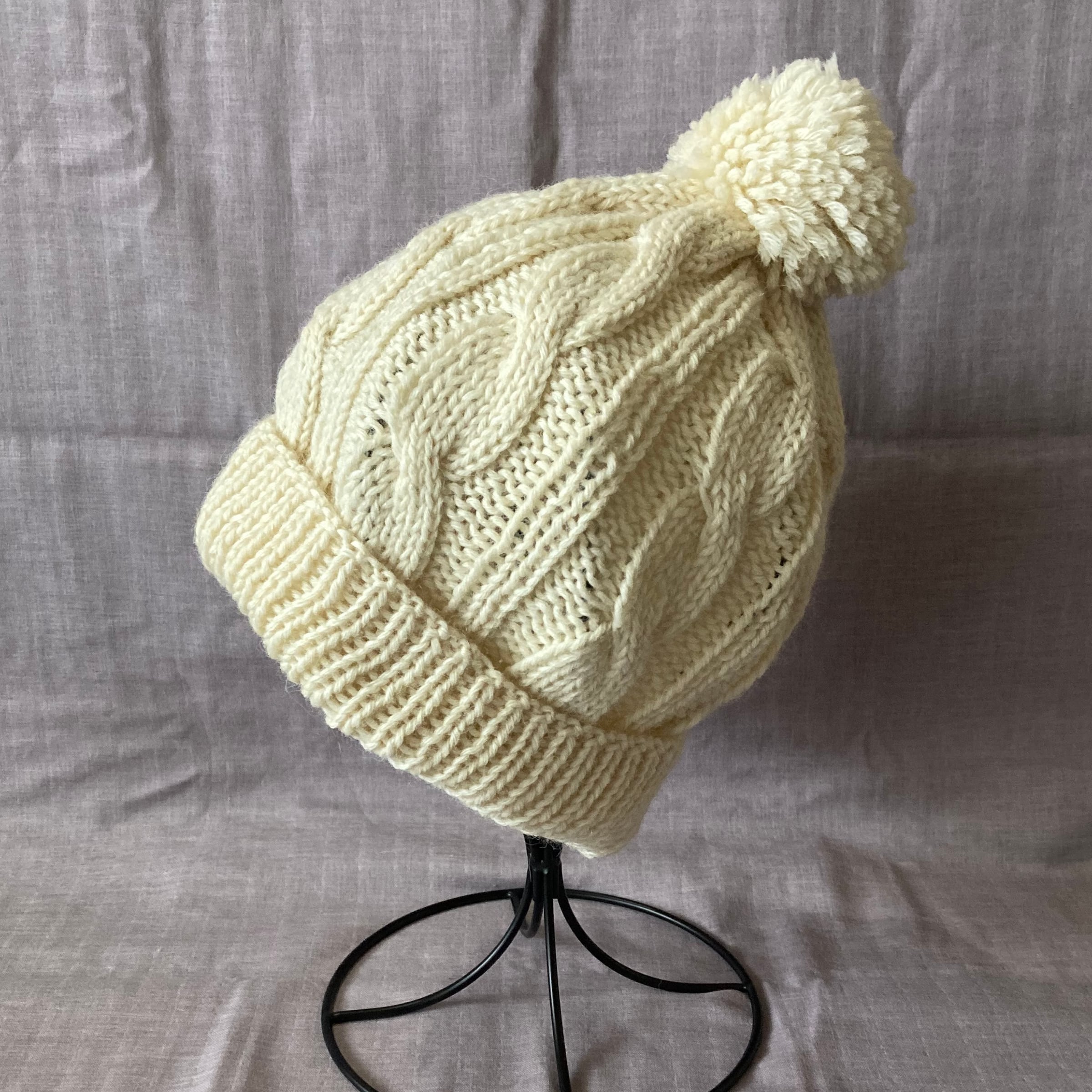 なわ編みをあしらったニット帽です。