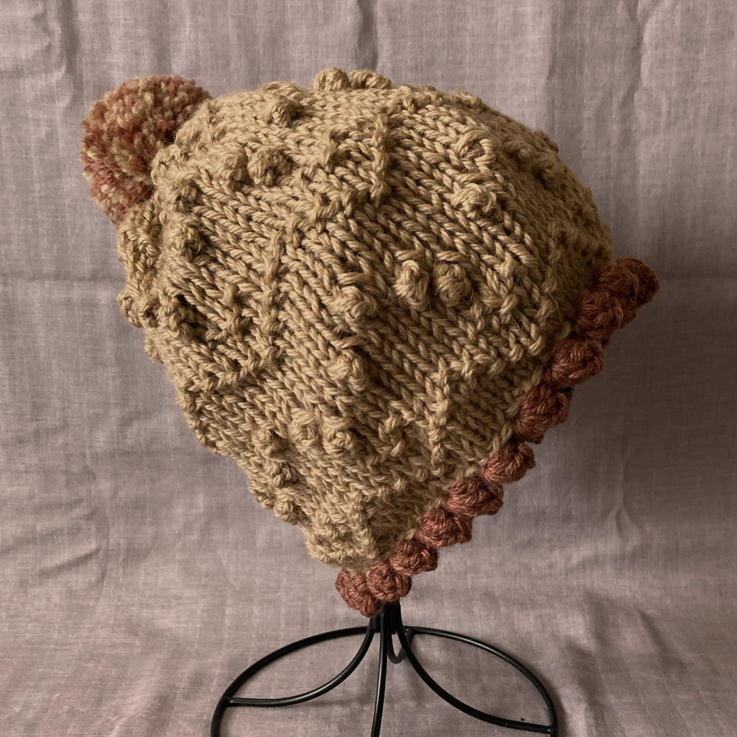 かぶり口にかぎ編みで玉編みをあしらったニット帽です。