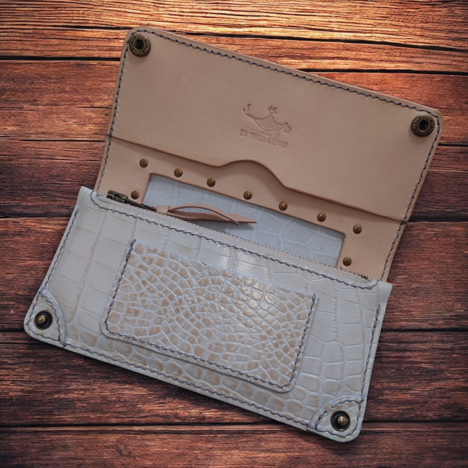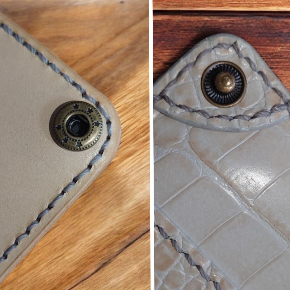 クロコダイル型押し(姫路レザー)とヌメ革(栃木レザー)コンビのロングウォレットです♫